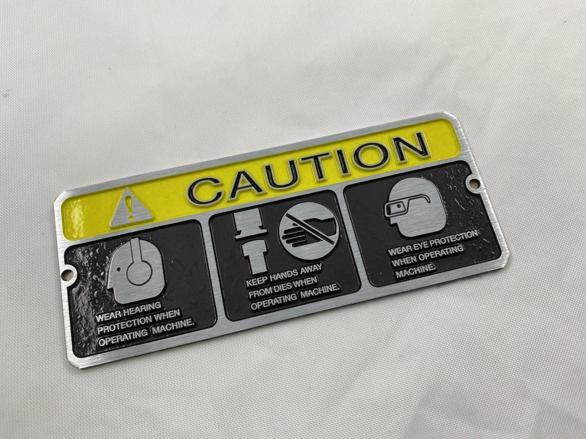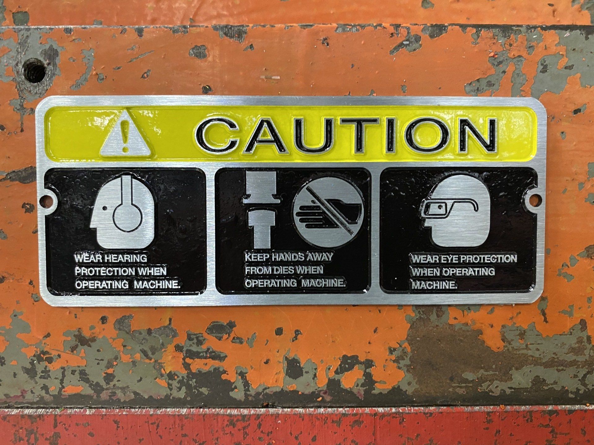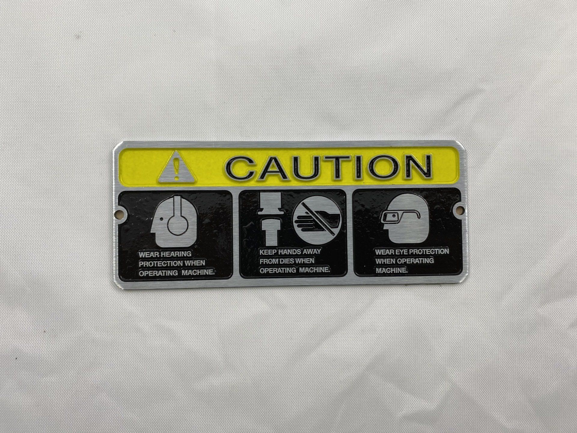 CAUTION METAL PUNCH PRESS PLATE, WEAR HEARING PROTECTION, HANDS AWAY, EYE PROTECTION